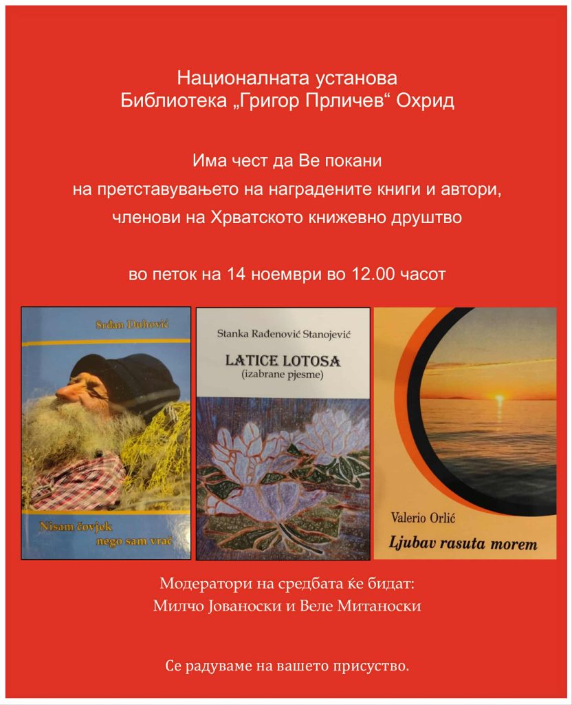 Во рамките на балканската турнеја на Хрватското книжевно друштво од Риека, утре – петок во 12 часот во НУ Библиотека „Григор Прличев“ во  Охрид ќе гостуваат тројца поети.