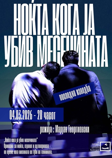 На 04.03.2026 во 20:00 часот, сцената на Народен театар Битола ќе ја пречека 30-тата и воедно последна изведба на „Ноќта кога ја убив месечината“, во режија на Марјан Георгиевски, кој и настапува во истата заедно со актерот Александар Копања.