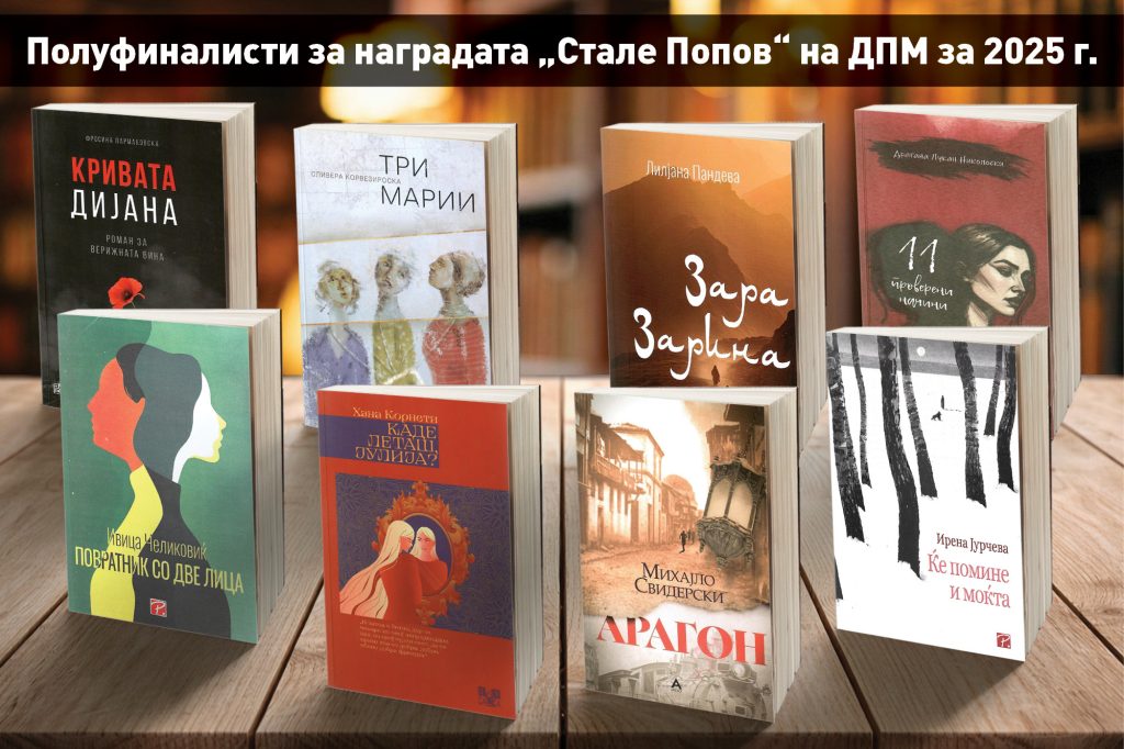 Од вкупно 17 дела во трка за наградата „Стале Попов“ на ДПМ, за најдобро прозно дело објавено во 2025 г., во полуфиналниот круг влегуваат следните 8 наслови: