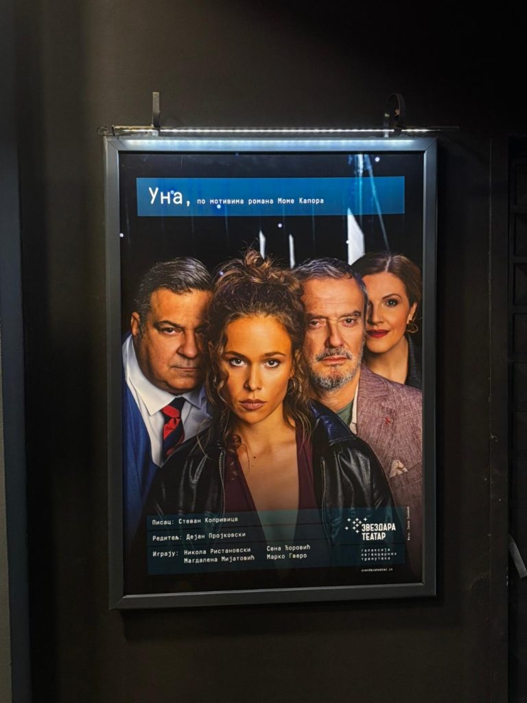 Култниот роман “Уна” од 1981 година на Момо Капор, синоќа вo Белград, доби сосем ново, модерно театарско руво, благодарејќи на исклучително добро уиграната екипа, Дејан Пројковски како режисер на претставата, Никола Ристановски во главната машка улога, како проф. Мишел Бабиќ, Валентин Светозарев како сценограф и Горан Трајковски како автор на музички теми.