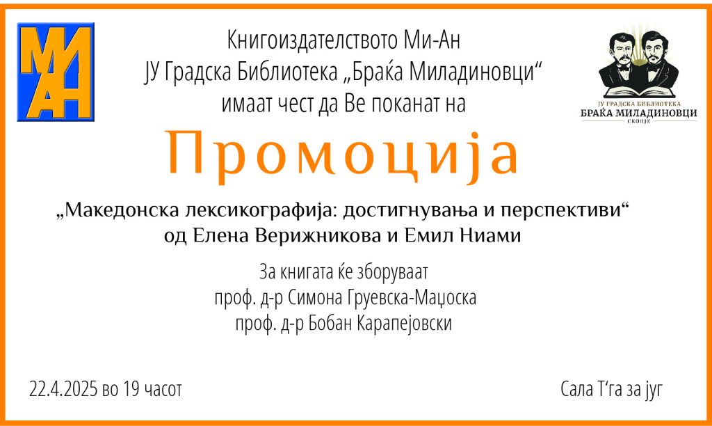 Во среда, 22 април, во 19.00 часот, во салата „Т‘га за Југ“ во Градската библиотека „Браќа Миладиновски“ во Скопје, ќе се одржи промоција на книгата „Македонска лексикографија: достигнувања и перспективи“ од Елена Вережникова и Емил Ниами. За книгата ќе зборуваат проф. д-р Симона Груевска-Маџоска и проф. д-р Бобан Карапејовски. Издавач е Книгоаиздателството Ми-Ан.