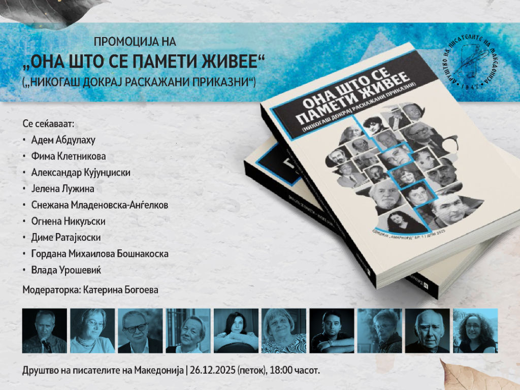 Во Друштвото на писателите на Македонија на 26.12.2025 г. со почеток во 18:00 часот ќе биде промовирана книгата „Она што се памети живее“ („Никогаш докрај раскажани приказни“) – збирка раскази што го чествува споменот на автори, поети и писатели, поранешни членови на Друштвото, на кои со радост и со уважување се сеќаваме.
