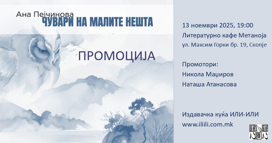 На 13 ноември во 19:00 во Литературното кафе Метаноја ќе се одржи промоција на четвртата збирка поезија на Ана Пејчинова, „Чувари на малите нешта“ во издание на „Или-Или“.