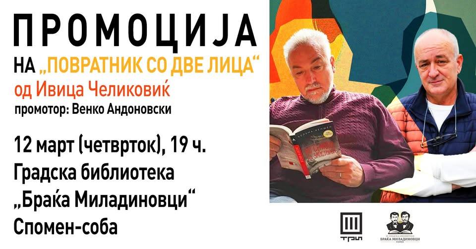 Вечерва од 19 ч. во Градската библиотека „Браќа Миладиновци“ ќе биде промовиран „Повратник со две лица“, седмиот роман на Ивица Челиковиќ, кој влезе во тесна конкуренција за „Роман на годината“!
