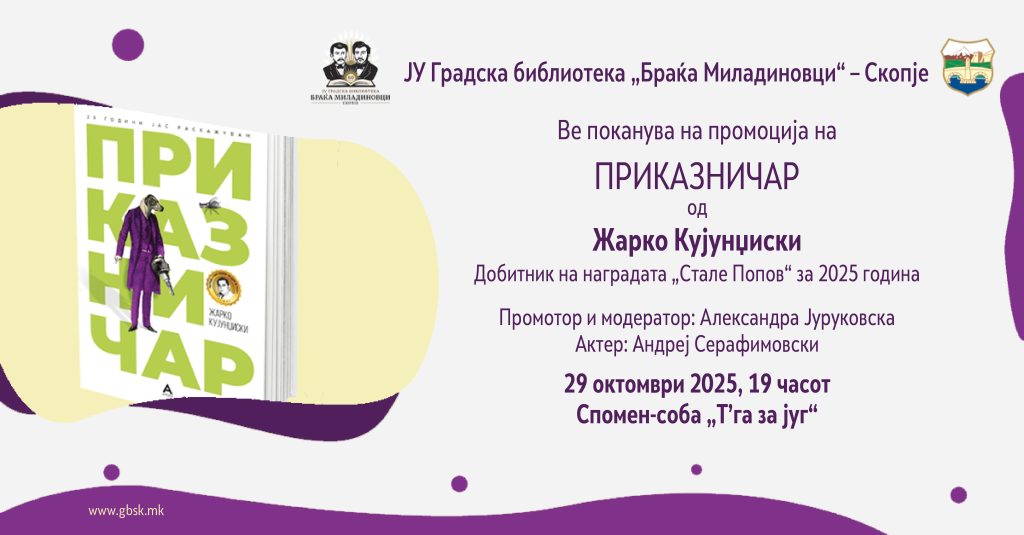 В среда (29 октомври) во 19 часот во Градската библиотека „Браќа Миладиновци“ ќе биде промовирана збирката раскази „Приказничар“ од Жарко Кујунџиски, добитник на наградата „Стале Попов“ за најдобро прозно остварување според Друштвото на писателите на Македонија во 2025 година. Модератор и промотор е Александра Јуруковска, а фрагменти од делото ќе чита актерот Андреј Серафимовски.