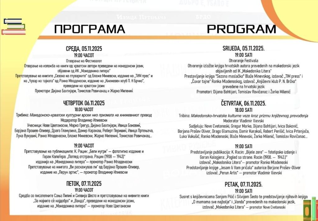 На програмата се промоции, тркалезна маса, гостувања на македонски автори и издавачи, изложба на книги од хрватски автори преведени на македонски јазик.