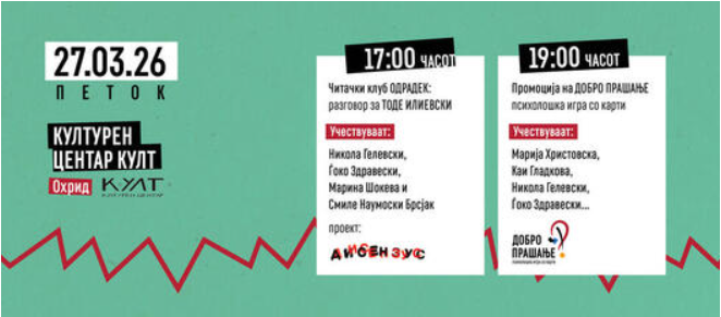 На истото место, во Култ, во 19 часот истиот ден ќе се одржи и промоција на ДОБРО ПРАШАЊЕ, психолошка игра со карти. Играта ќе ја промовираат, низ играње и разговор: Марија Христовска, Каи Гладкова, Никола Гелевски, Ѓоко Здравески…