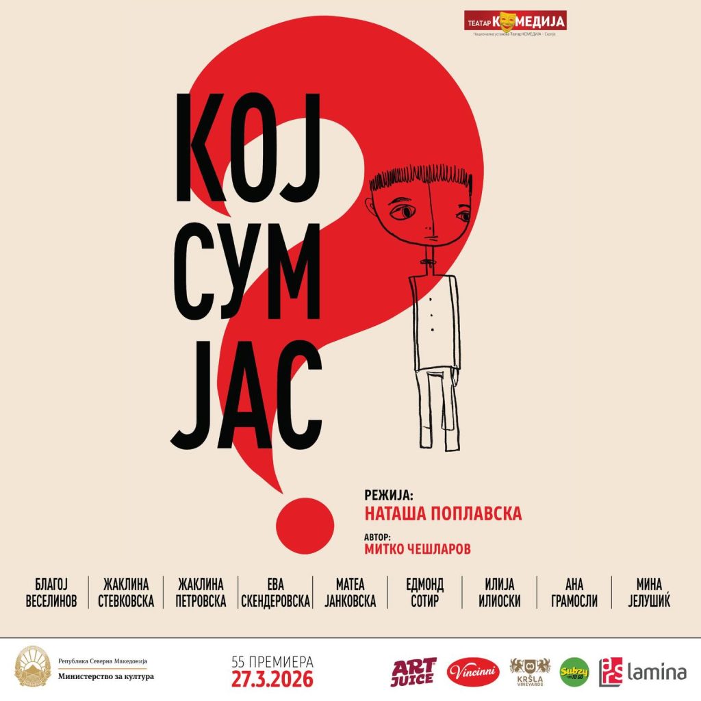 Со праизведба на претставата „Кој сум јас“ чиј автор е Митко Чешларов, а во режија на Наташа Поплавска, Театарот Комедија ќе го одбележи 27 Март, Светскиот ден на театарот и 14. роденден на Театарот. Ова е 55-та премиера во Комедија.