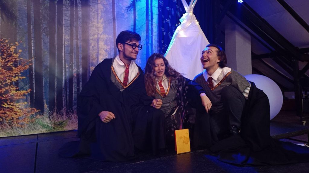 Во претстваата играат: Хари- Бобан Алексоски, Хермиона, Валдена- Надица Петрова, Визли, Гринимор- Бранко Михајлоски, Волдеморд- Тодор Стојковски – (глас) и Професорката Меконакен- Ванеса Тримчевска – (глас).