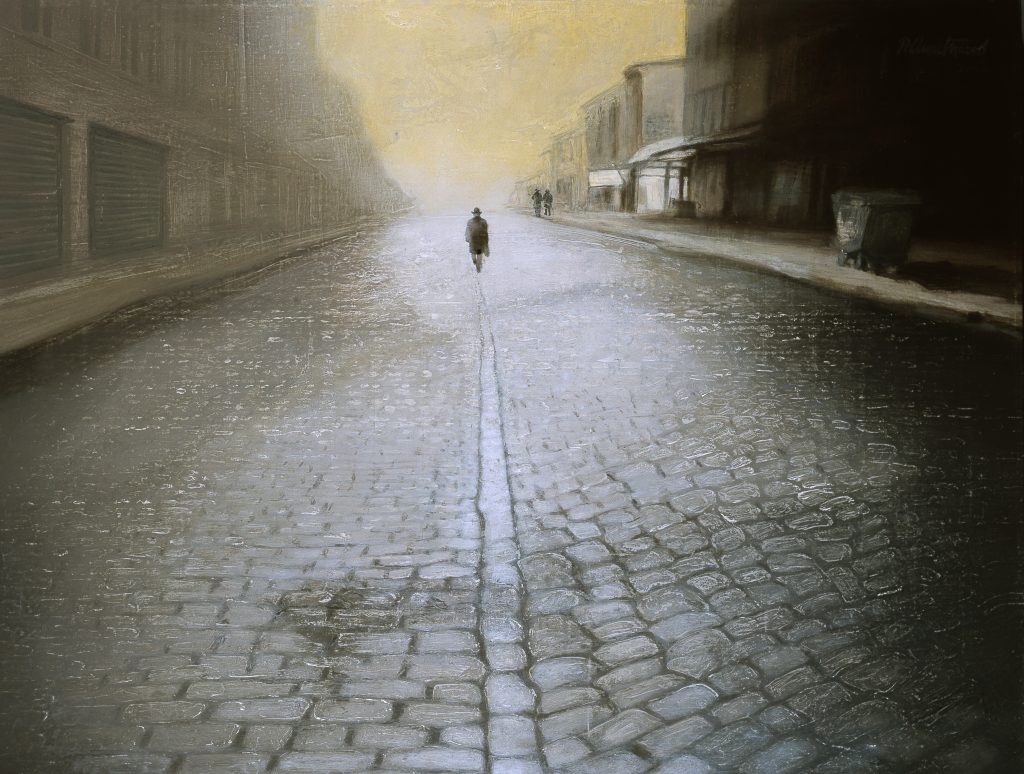 Меѓу строгоста на формата и меланхолијата, тој го истражува просторот во и околу човекот, надворешниот – реален и физички и внатрешниот – имагинарен и метафизички. Како контратежа на сцените со раздвижени толпи на луѓе во кои речиси можете да го слушнете уличниот џагор, се насликани тивките, осамени, широки пространства во кои човекот е изолиран и сам како во пустина. Понекогаш авторот се става во улога на тивок и дистанциран набљудувач на светот околу него, свет кој се наоѓа надвор од неговиот прозорец…