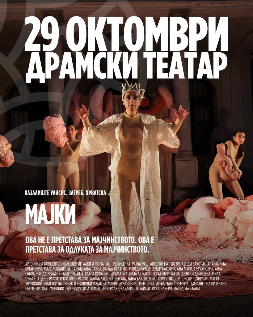 Претставата „Мајки“ на Колектив Игралке и Рајна Рац, во продукција на Казалиште Улисис од Загреб, ќе биде изведена вечерва во 20 часот, на сцената на Драмскиот театар во Скопје. Гостувањето е во рамките на фестивалот РУТА, што ќе трае до 31 октомври.