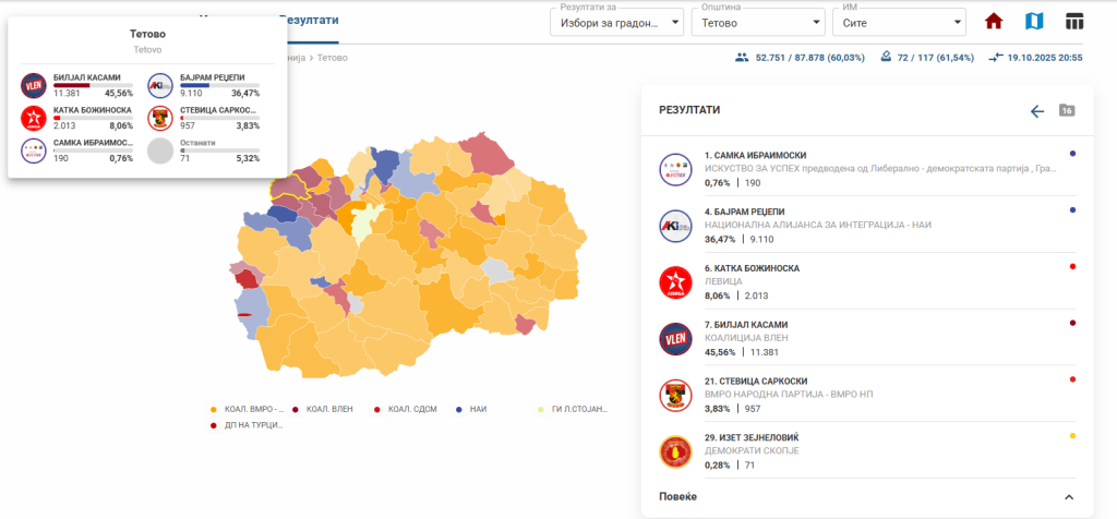 Безбеден е тронот на Касами во Тетово Македонија 19.10.2025 На 60,03% од пребројаните гласови во општина Тетово актуелниот градоначалник Биљал Касами е во убедлива предност пред кандидатот на Националната алијанса за интеграција, Бајрам Реџепи. Од вкупно 52751 обработени гласови Касами има освоено 11381. Вкупен број на избирачи во избирачкиот список87.878Број на обработени избирачи(60,03%)52.751Вкупен број на избирачки места (без ЗРД)117Број на обработени избирачки места (без ЗРД)(61,54%)72 Вкупен број на избирачи кои гласале24.978Вкупен број на важечки гласачки ливчиња23.722Вкупен број на неважечки гласачки ливчиња1.256Излезност*47,35%
