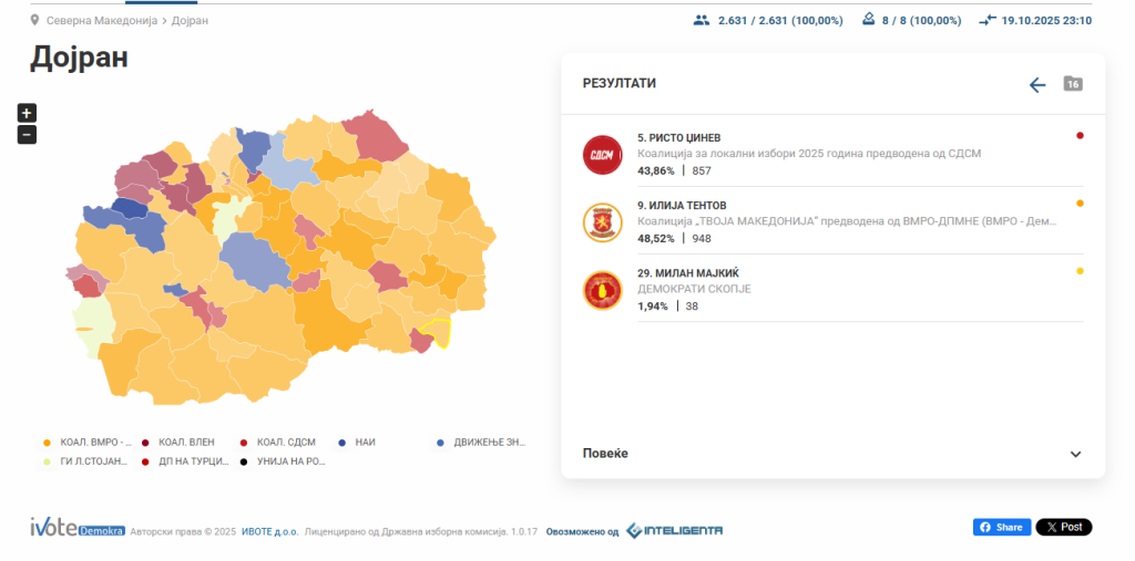 ДИК: Дојран ќе избира градоначалник во втор круг Македонија 19.10.2025 ДИК ги обработи 100 отсто од гласовите во Дојран. Кандидатот на ВМРО-ДПМНЕ и коалицијата освои 948 гласа, што не се доволни за победа во прв круг. Во втор круг оди и кандидатот на коалицијата на СДСМ, Ристо Џинев, за кого гласале 857 граѓани.