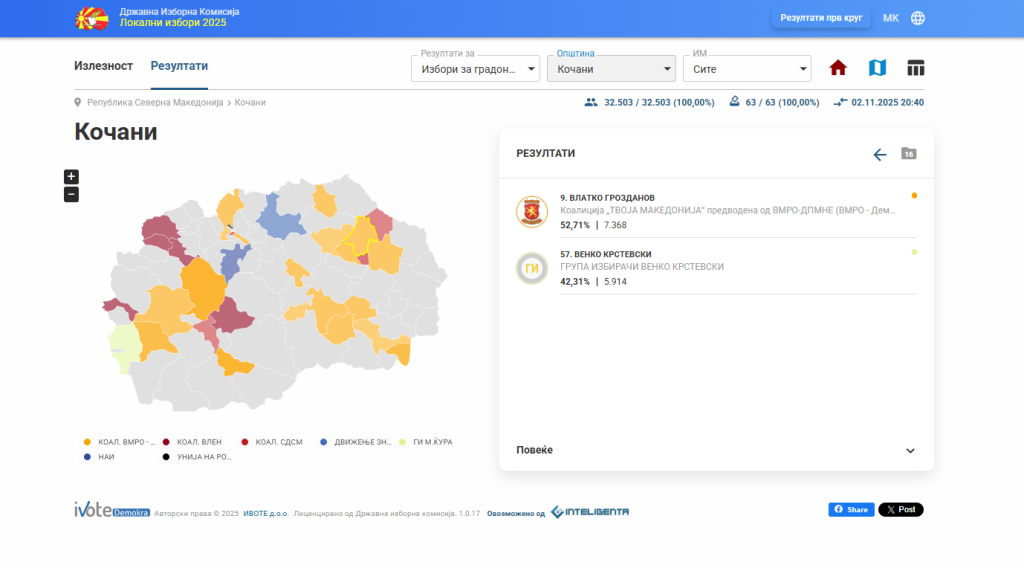 Обработени се сите 63 избирачки места (100%), при што на гласање излегле 32.503 граѓани од запишаните во избирачкиот список.