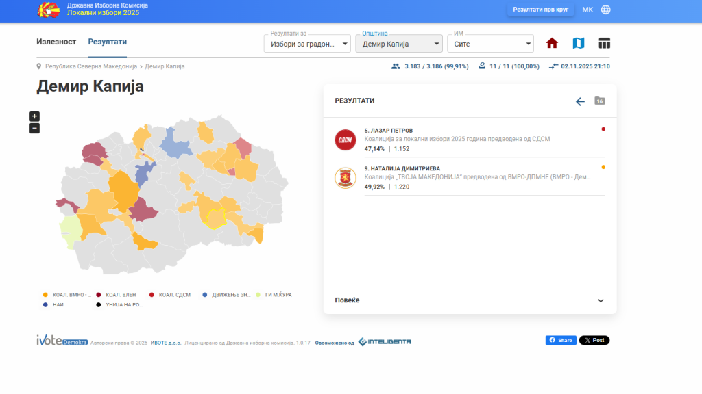 Со тоа, ВМРО-ДПМНЕ ја задржува предноста и во Демир Капија, каде резултатите се целосно обработени и потврдени од ДИК.