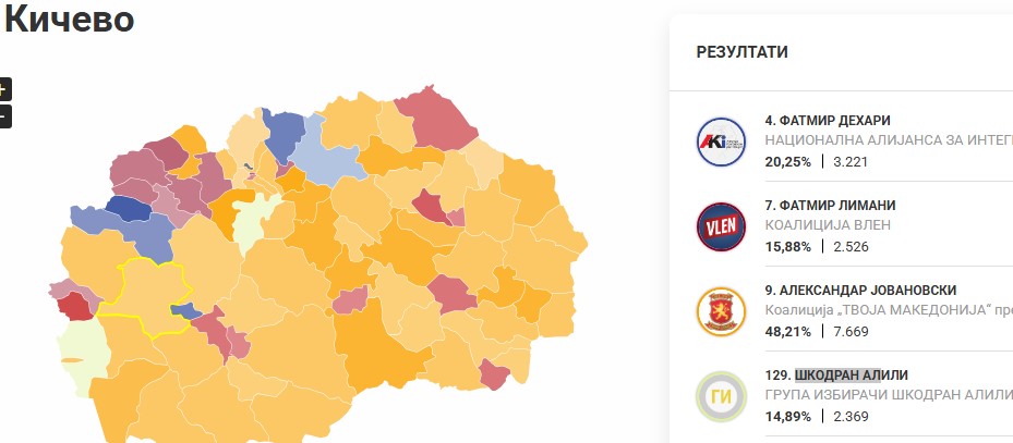 Неизвесна е трката за градоначалник на Кичево. Од 62 посто преброени гласови води кандидатот на ВМРО-ДПМНЕ АЛЕКСАНДАР ЈОВАНОВСКИ со 7269 гласови. Втор е Фатмир Лимани од Вреди со 3326. На трето е актуелниот градоначалник Фатмир Дехари со 3210 а четврти е Шкондран Алили.