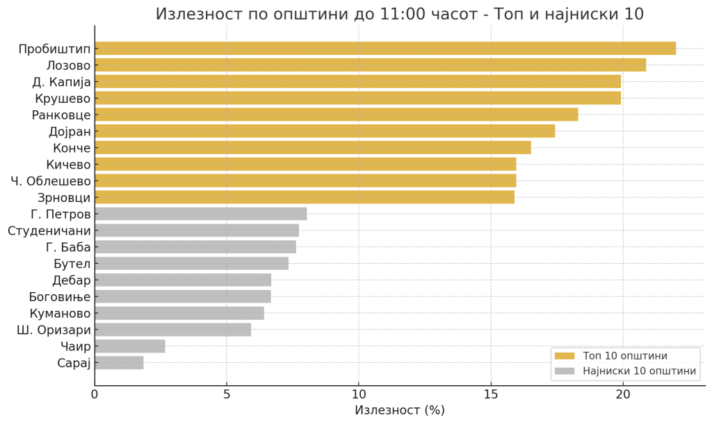 Источните и југоисточните општини, како и помалите градови, и натаму го предводат списокот со највисока активност, додека поголемите урбани средини, особено Скопје, Куманово и Тетово, бележат послаб одзив на гласачите во првиот дел од денот.