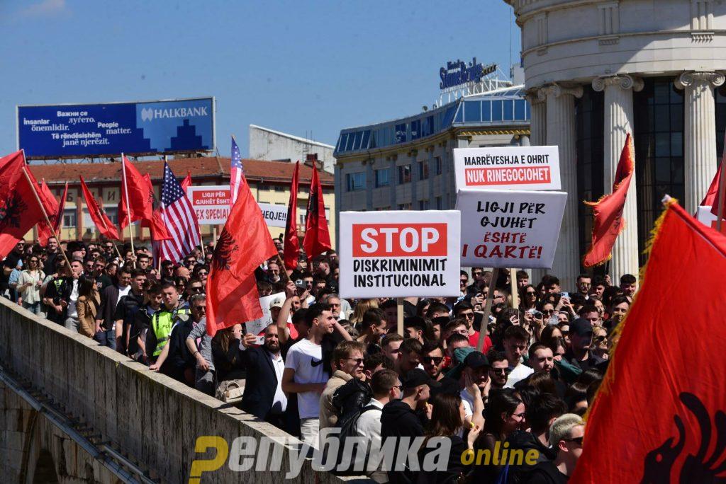 Студентите Албанци протестираа во центарот на Скопје со барање правосудниот испит да го полагаат на Албански јазик. Речиси сите држеа знамиња на САД. Каква врска има правосудниот испит со американското знаме. Времето на знамиња помина. Ако веќе сакате да покажете лојалност кон државата мафтајте со македонското знаме кое не е ниту само на Македонците туку на сите граѓани. Ете така се сака државата.