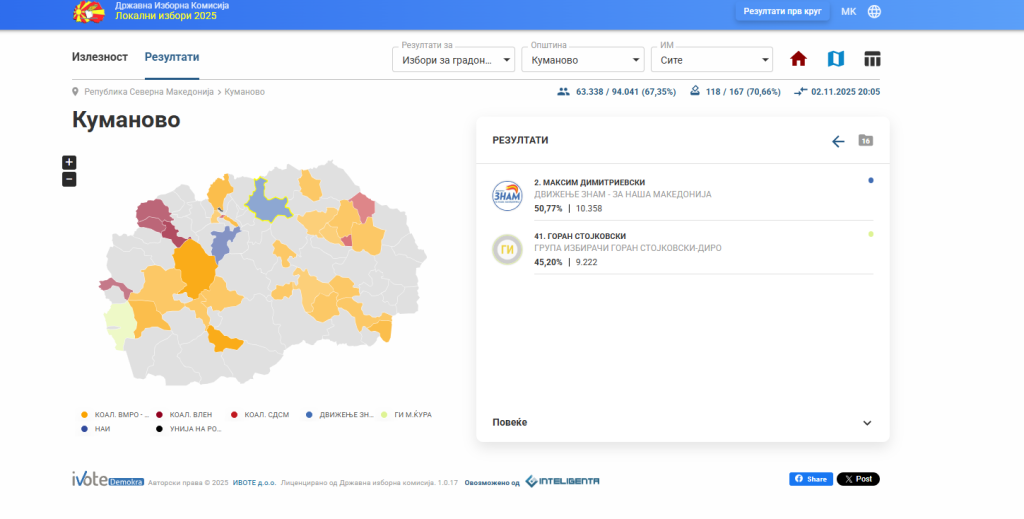 Кандидатот на Движењето ЗНАМ – За наша Македонија, Максим Димитриевски, води во вториот круг на локалните избори во Куманово со освоени 50,77% од гласовите, односно 10.358 гласа.