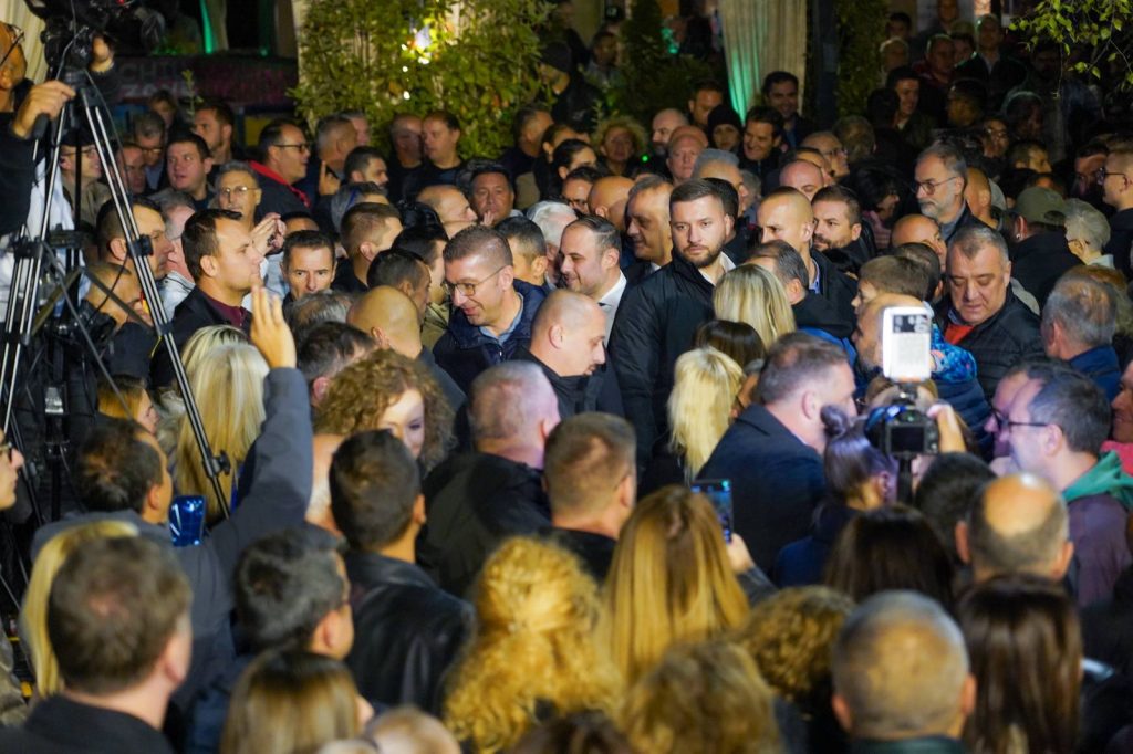 „Тука сме во Карпош, каде граѓаните се соочуваат со еден феномен на киднапирање на општината за лични интереси и криење зад функцијата зашто без функцијата тој човек е ништо. Но внимавајте има една замка голема која што се обидуваат да ја подготват, а пред неколку дена тајно во седиштето на СДСМ овој кандидатот и актуелен градоначалник во Карпош заедно со претседателот на СДСМ мислеле, премерувале како да обезбедат 2000 гласа за него од СДСМ да ја пуштат нивната кандидатка низ вода а тој да влезел во вториот круг. Но тука има непознати во оваа равенка. А јас знаете дека сум по равенките и математички прецизно ќе им порачам. Прв проблем, народот не е квантум на гласови, не е тоа вреќа, па ќе купите и ќе претурите, тоа се луѓе со судбини, со иднина, со предизвици, со животи. Тоа се семејства со мечти и амбиции, кои знаат, кои критично гледаат на работите, и оценуваат. Посебно затоа што анкетите се така јасни што дури и од Горни Милановац да донесете гласачи, каде еден познат македонски политичар имал кариера во минатото, повторно нема да им успее.“ истакна Мицкоски.