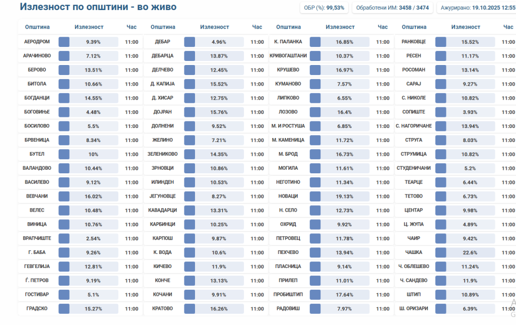 Најголема излезност во Новаци и Пробиштип, најмала Сопиште Македонија 19.10.2025 До 11 часот и 15 минути најголема излезност има во Новаци 19,12% , и Пробиштип 17.64%,. Најмала заинтересираност досега покажале жителите на Сопиште, каде гласале само 3,9%, потоа Центар Жупа 4,89% и Дебар 4,96.