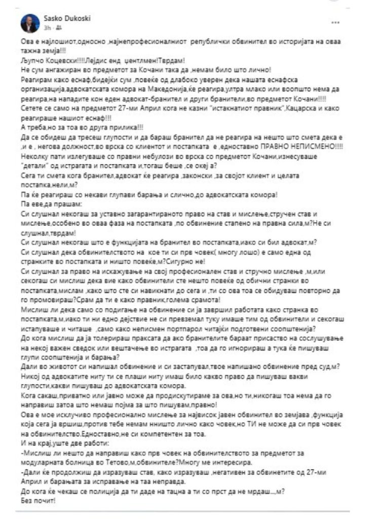Адвокатот Сашо Дуковски на социјалните мрежи директно му се обрати на првиот човек на Основното јавно обвинителство Љупчо Коцевски, за кого рече дека не е компетентен да биде прв обвинител.