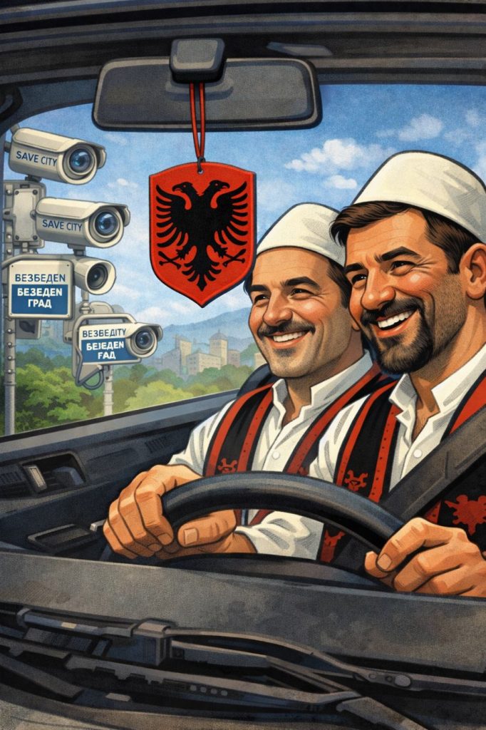 Ги знаете двајцата другари Љуљзим и Идриз Тие се знаат од мали, некогаш беа скарани заради пуста политика, ама сега пак се блиски. Како брача. Ги спои љубовта кон колите и камерите. Љуљзим живее во Чаир и вози Голф тројка. Секој ден кога иде на Кванташки по нова роба го фаќа камерата и го казнува само затоа што е Албанец. Камерата му ја препознава колата на која се мрда раче на шал таблата и виси знаменце од УЧК и одма казна 15 еура.