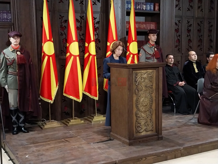 Пред нас е задачата да ја спречиме фрагментацијата на македонското општество со тоа што одново ќе ги научиме доблестите коишто ја одржуваат заедницата. Како и во Климентово време и нам ни е потребна заедничка, повисока цел, околу која ќе градиме односи и ќе премостуваме разлики. Преку владеење на правото и борба против корупцијата, преку социјална правда и заемна грижа да го обновиме општествениот договор на слободни граѓани, еднакви пред законот, сплотени околу општото добро, порача во обраќање претседателката Гордана Сиљановска-Давкова на Свечената академија по повод државниот празник „Св. Климент Охридски“, која вечерва се одржа под незјино покровителство.