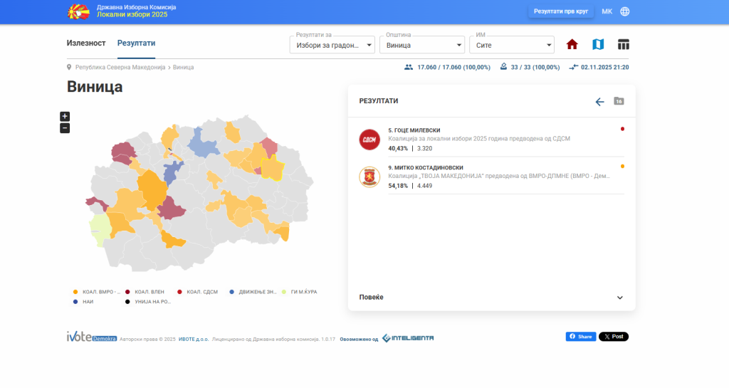 Во Виница, по 100% обработени избирачки места, победи коалицијата „Твоја Македонија“ предводена од ВМРО-ДПМНЕ.