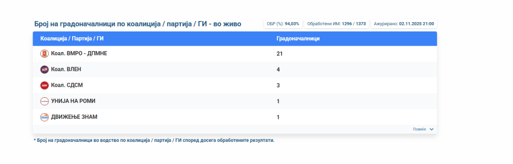 Според најновите резултати објавени од Државната изборна комисија (ДИК) вечерва во 21:00 часот, коалицијата „Твоја Македонија“ предводена од ВМРО-ДПМНЕ води во 21 општина низ државата, што ја потврдува нејзината доминантна позиција во вториот круг од локалните избори.