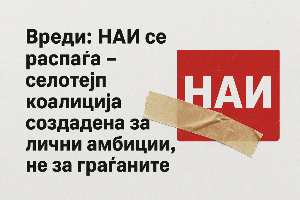 Албанската опозиција денес личи на „стар шатор што се кине на прв ветер“, оценува Движењето Вреди во ново соопштение, коментирајќи го, како што велат, распадот на коалицијата НАИ. Според партијата, она на што одамна предупредувале станало реалност и коалицијата, која ја нарекуваат „селотејп сојуз“, претставува „најголема политичка измама во последните години“.