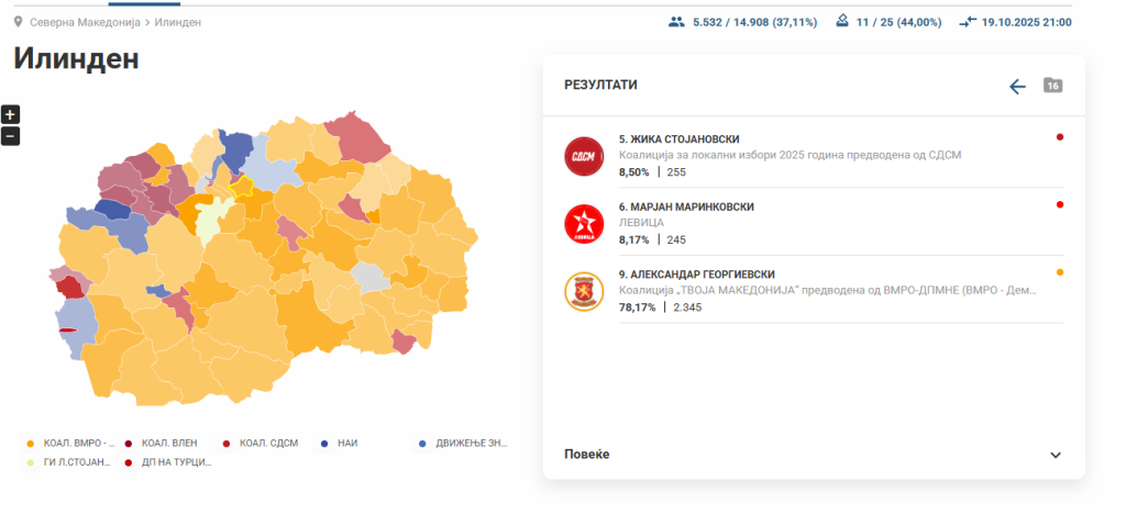 Поранешниот градоначалник на Илинден, Жика Стојановски убедливо губи. На овие избори, Стојановски кој долги години управуваше со Општината како кадар на ВМРО-ДПМНЕ, е кандидат на СДСМ. Но според ДИК, од досега обработени 37 отсто од гласовите, Александар Георгиевски од ВМРО-ДПМНЕ има 2345 гласа, наспроти 255 гласа за Стојановски и 245 гласа за Марјан Маринковски од Левица.