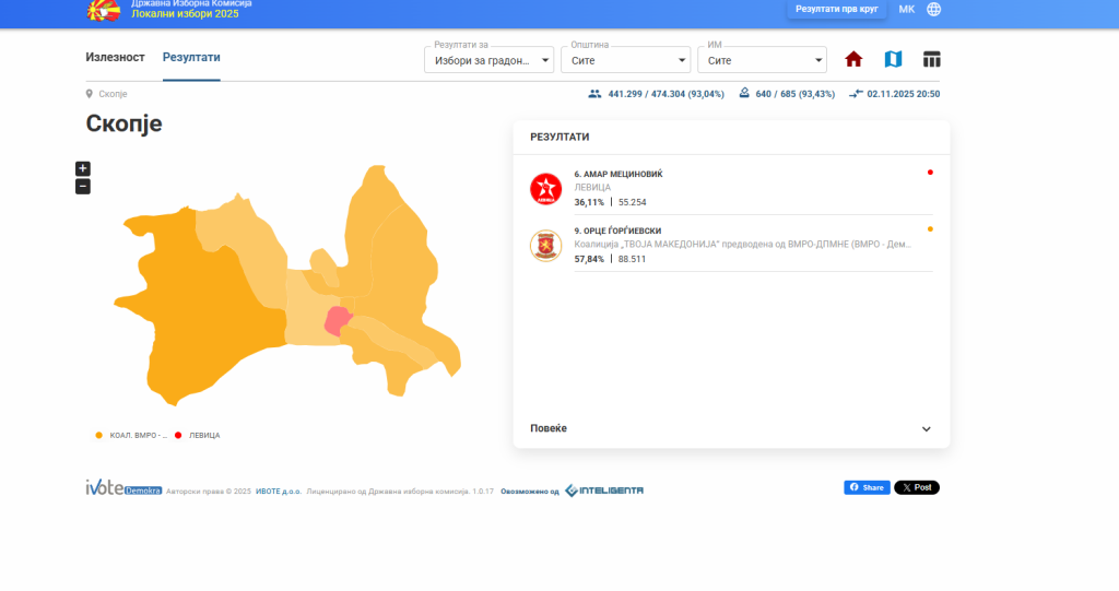 Единствен исклучок е Општина Центар, каде што победа бележи кандидатот на Левица, Амар Мециновиќ.