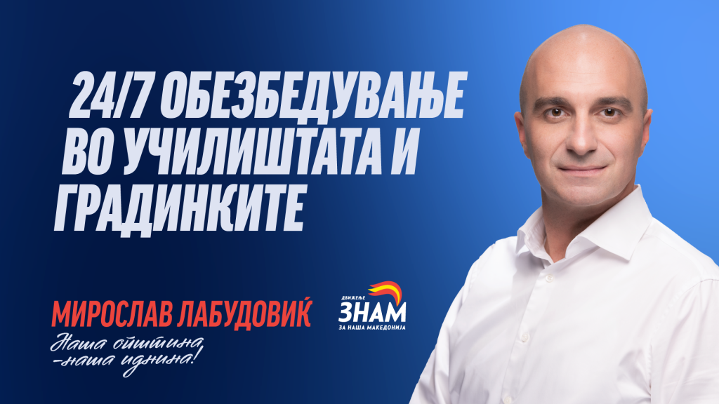 Безбедноста на децата мора да биде обврска на општината, а не трошок за родителите“, порача Мирослав Лабудовиќ кандидат на ЗНАМ за градоначалник на Општина Центар. Тој најави дека дел од неговата програма е воведување 24-часовно физичко обезбедување во сите училишта и градинки на територијата на Центар.