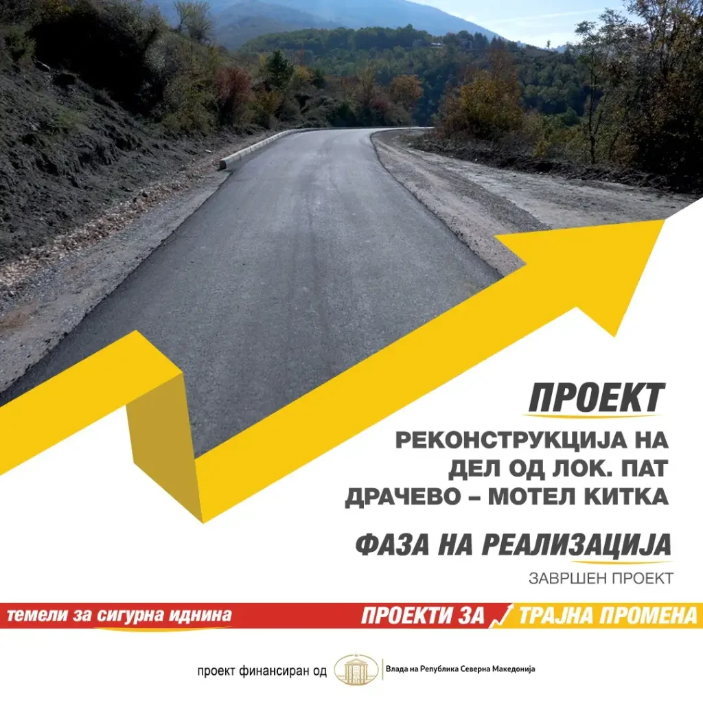 Реконструиран е дел од локалниот пат Драчево – мотел „Китка“. Со вкупна должина од 6,42 километри и ширина на коловозот од 3,5 метри, патот доби стабилна, функционална и долготрајна сообраќајна инфраструктура, објави денеска на социјалните мрежи премиерот Христијан Мицкоски, во делот „Проекти за трајна промена – темели за сигурна иднина“.