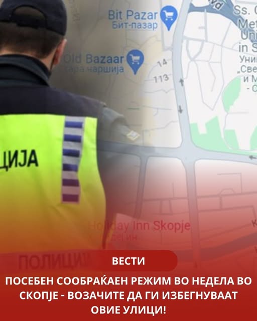 Во недела (05.04.2026) со почеток во 10:00 часот, во организација на Сојуз на спортови на Скопје, ќе се одржи улична трка со траса на движење од булевар „Илинден“ пред фонтана Лотус (старт и цел) право долж булевар „Илинден“ до крстосница со булевар „8-ми Септември“ каде се врти полукружно назад по булеварот „Илинден“ до целта фонтана Лотус, информираат од МВР.