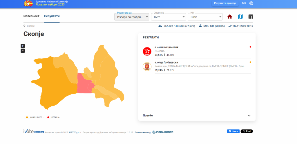Според најновите податоци на Државната изборна комисија (ДИК), обработени се 540 од вкупно 685 избирачки места, што претставува 78,83%. Излезноста во главниот град изнесува 77,53%, односно 367.722 гласачи од запишаните 474.304.