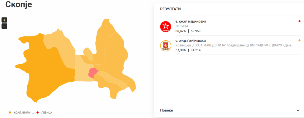 Кандидатот на ВМРО-ДПМНЕ, Орце Ѓорѓиевски, победи во вториот круг од локалните избори за градоначалник на Скопје. Според речиси конечните резултати на Државната изборна комисија, по преброени 98,55 отсто од гласовите, Ѓорѓиевски освоил 94.214 гласови, наспроти Амар Мециновиќ од Левица, кој добил поддршка од 59.959 граѓани.