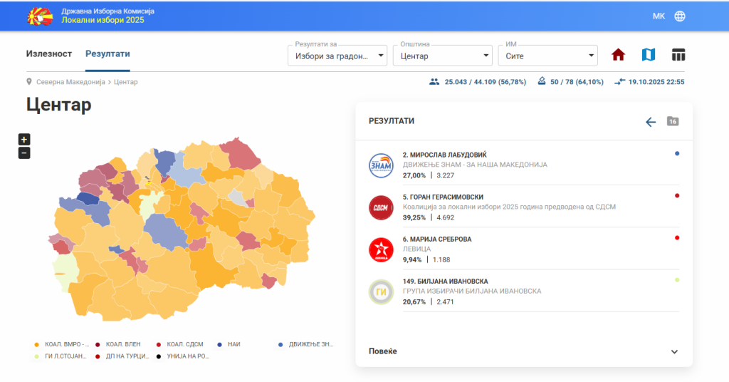 Кандидатот на СДСМ за општина Центар Горан Герасимовски ќе оди во втор круг заедно со кандидатот на ЗНАМ, Мирослав Лабудовиќ.