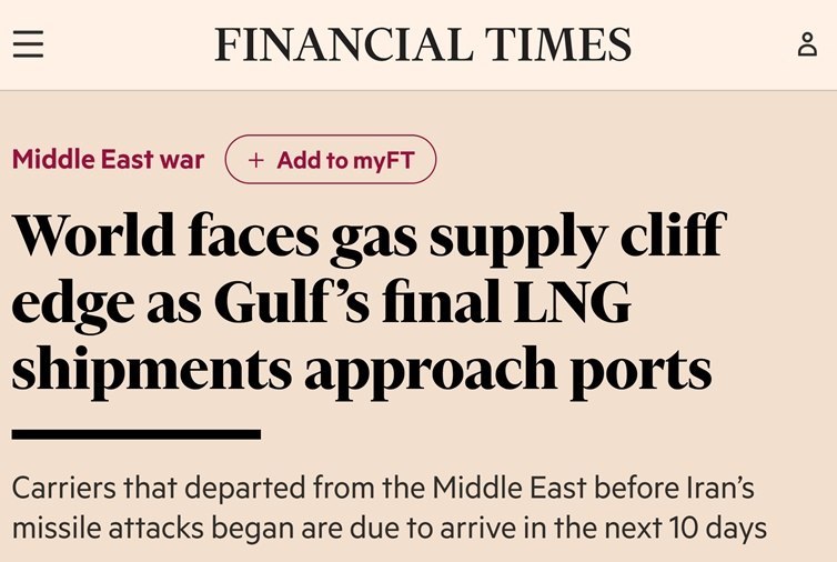 Блокирањето на Ормутскиот Теснец и нападите врз енергетските постројки ги запреа пратките на течен природен гас од земјите од Персискиот Залив. Сепак, голем број танкери натоварени пред ескалацијата на конфликтот сè уште не стигнале до своите крајни дестинации. На овие бродови не им остануваат повеќе од 10 дена дур да го испорачаат својот товар, наведува британскиот „Фајненшл тајмс“.