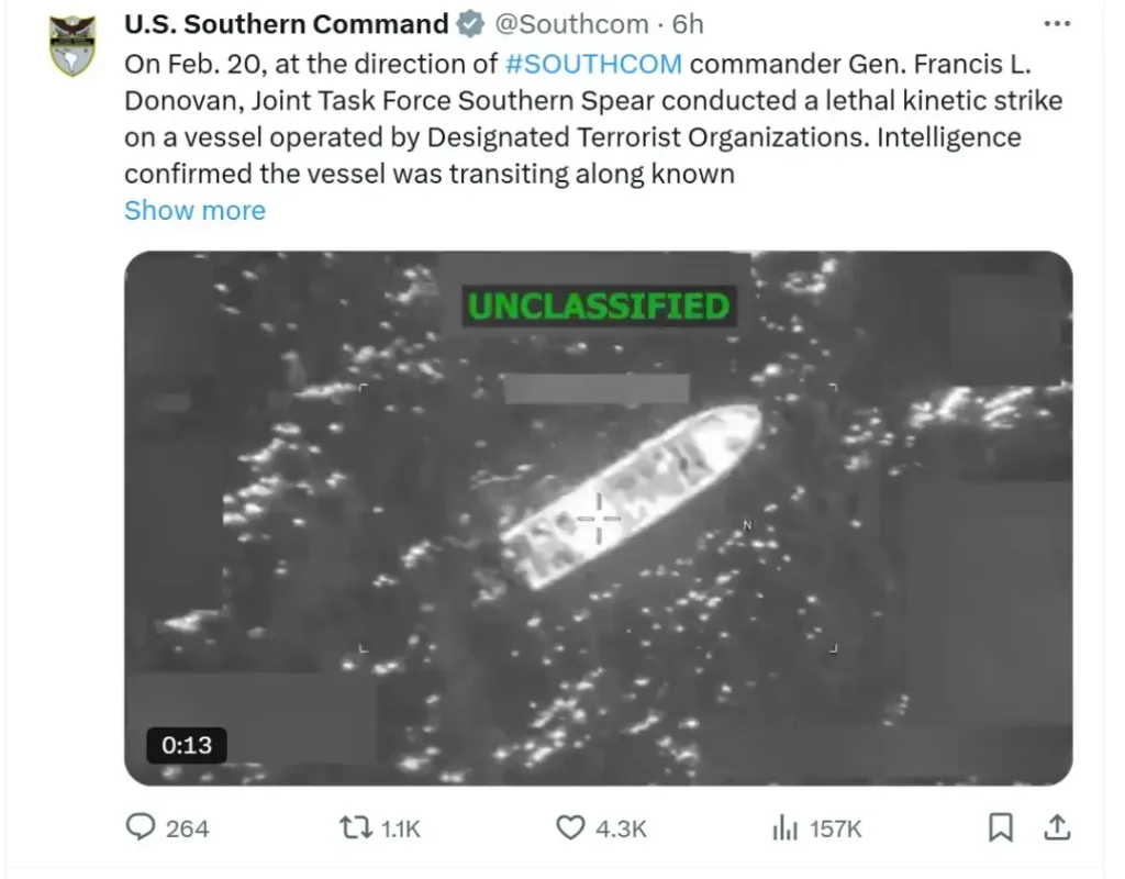 Јужната команда на САД (USSOUTHCOM) објави снимки од нападот на својата веб-страница и соопшти дека бродот бил „вклучен во операции за трговија со дрога“.