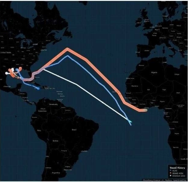 Танкерите „Алијаи“, „Минерва Васо“ и „Гранд Асе6“ беа натоварени со гориво во САД и првично беа наменети за Европа, со дестинации во Амстердам и Гибралтар. Но, нивните рути оттогаш се промениле, пишува „Блумберг“.