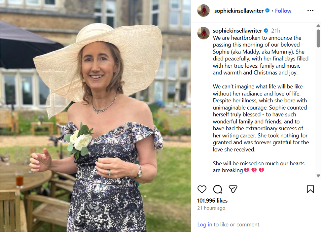 Во соопштението објавено на нејзиниот Инстаграм-профил, семејството наведува дека писателката починала спокојно, покрај своите најблиски.