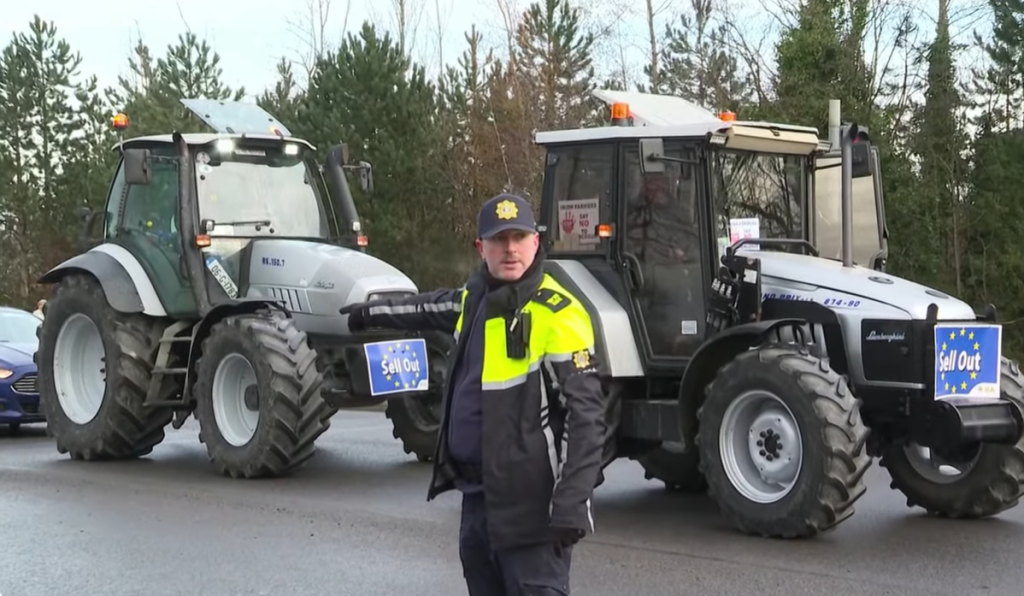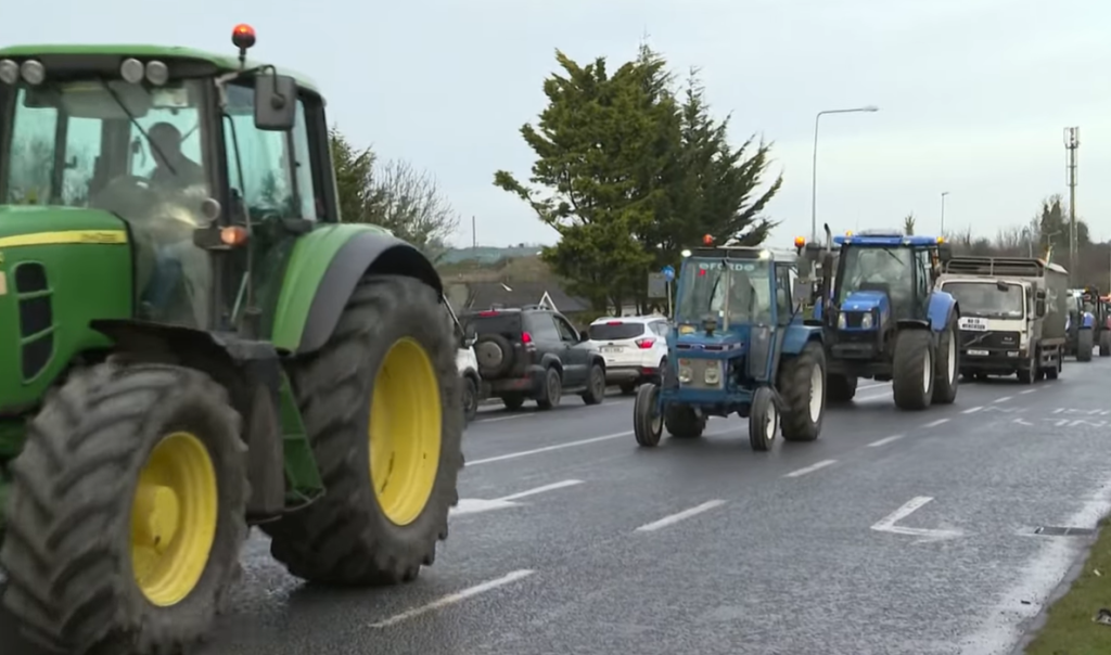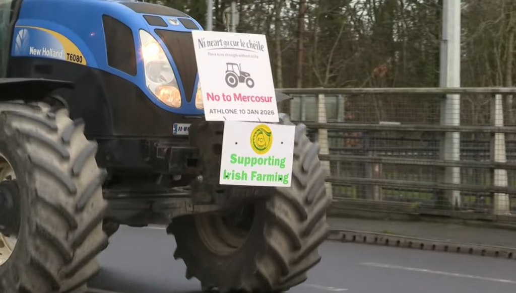 Колони трактори се движат низ улиците на градот Атлон, во централна Ирска, каде демонстрантите носат транспаренти со пораките „Стоп за ЕУ–Меркосур“ и знамиња на ЕУ со натпис „распродажба“.