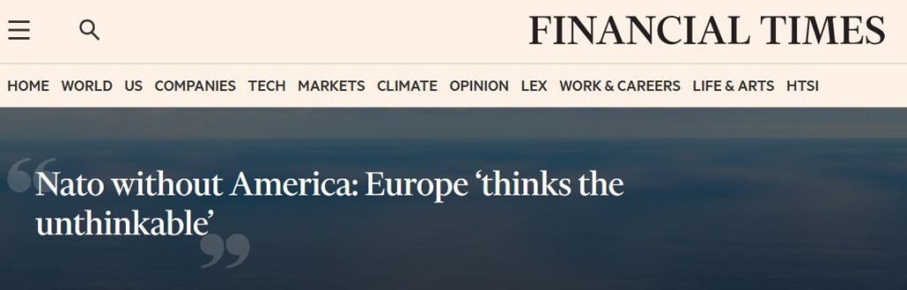 Европските лидери се почесто разговараат и размислуваат за планови за НАТО без учество на САД, пишува „Фајненшл тајмс“.