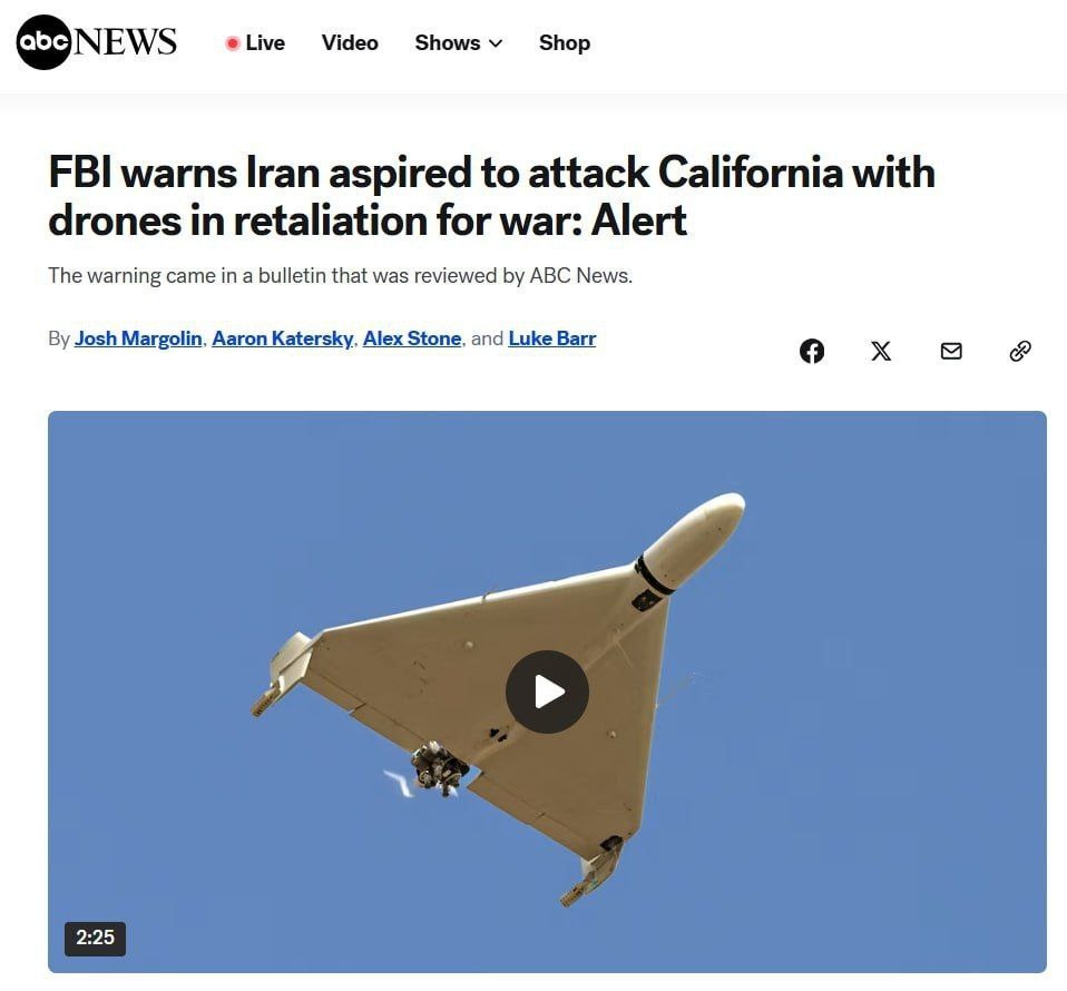 ФБИ испратил предупредување до агенциите за спроведување на законот во Калифорнија за можен ирански напад со беспилотни летала врз западниот брег на САД, објави „АБЦ њуз“, повикувајќи се на официјален документ.