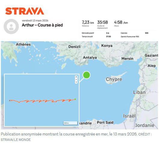 Според изданието, војник по име Артур ги објавил своите податоци за тренинзите на апликацијата, а објавата ги открила координатите на движење на бродот во Медитеранот, како и неговата моментална локација северозападно од Кипар, на околу 100 км од турскиот брег.