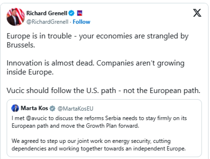 „Европа е во проблеми – вашите економии ги задушува Брисел. Иновацијата е речиси мртва. Компаниите не растат во Европа. Вучиќ треба да го следи патот на САД, а не европскиот пат“, напиша Ричард Гренел на X.