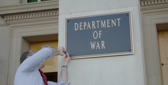Бронзена плоча со натпис „Министерство за војна“ беше поставена на влезот во Пентагон од страна на американскиот министер за одбрана Пит Хегсет, дури и го постави соодветното видео на социјалните мрежи, официјално најавувајќи ја новата ера на Министерството за одбрана, соопштија вчера од  Министерството.