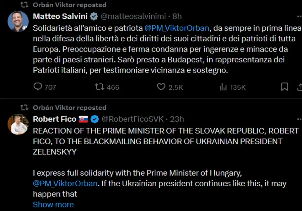 Неговата поддршка до Орбан доаѓа откако унгарскиот премиер доби директна закана од страна на украинскиот претседател Володомир Зеленски, дека ако не ја одблокира помошта од 90 милијарди за Украина од Брисел, ќе им нареди на украинските војници „да се позанимаваат со него“.